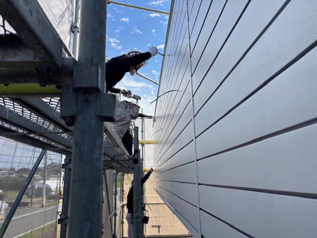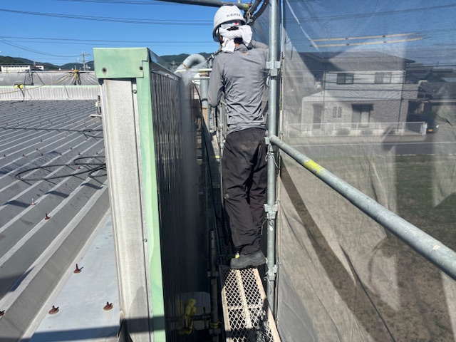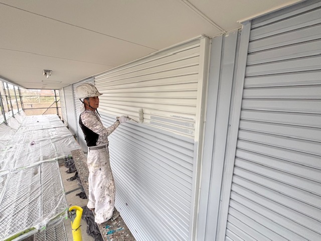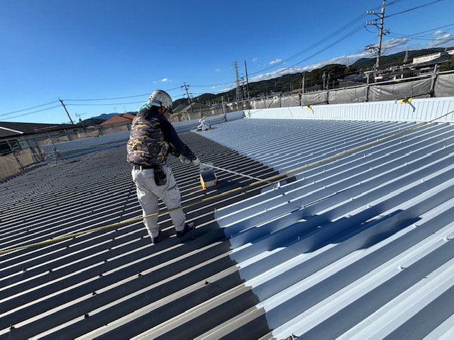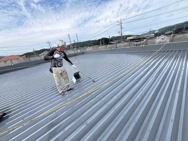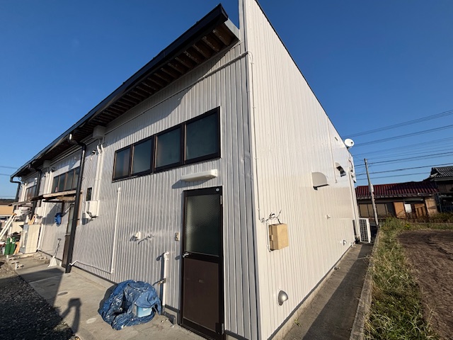 屋根、壁トタン、樋、シャッターなど弱溶剤シリコン仕上げです。屋根はボルト