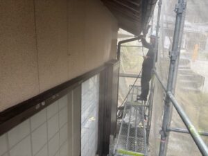 弱溶剤シリコン仕上げで面戸は板金加工です。足場解体後テラスにポリカ貼って