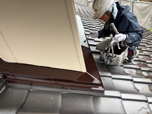 微弾性フィラー下塗り、弱溶剤シリコンの艶消し仕上げです。樋、水切りなどは、
